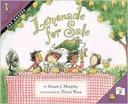 1. Lemonade for Sale by Stuart J. Murphy is about, four kids, Danny, Meg, Sheri, and Matthew, who sell lemonade in order to fix their Elm Street Kids' Clubhouse, and they have no money. They bet that if they sold 30 or 40 cups per day for a week, they would be able to fix their clubhouse. So they decided to keep track of their sales. Sheri creates a bar graph to look at how many sales they have every day, by putting the number of cups on the side (y-axis) and putting the days of the week on the bottom (x-axis). On the first day, Petey the parrot, squawked at people going by, to tell them about the lemonade sale. They all worked together, as Matthew squeezed the lemons, Meg mixed the sugar, Danny did the ice and poured the lemonade into cups, and Sheri kept track of the number of cups they were selling. On Monday, they sold 30 cups, so Sheri filled in the bar above Monday up to the 30 on the side. On Tuesday and Wednesday, they continued to see their sales of cups of lemonade increase, then they see a huge drop. They see that the juggler down the street is stealing their sales. So, then they invite the juggler to do the act next to the lemonade stand, and then the sales make a giant leap. Also, each cup costs 25 cents, so this also comes in handy when looking at this book in a mathematical sense, in order to calculate more with the information given.
